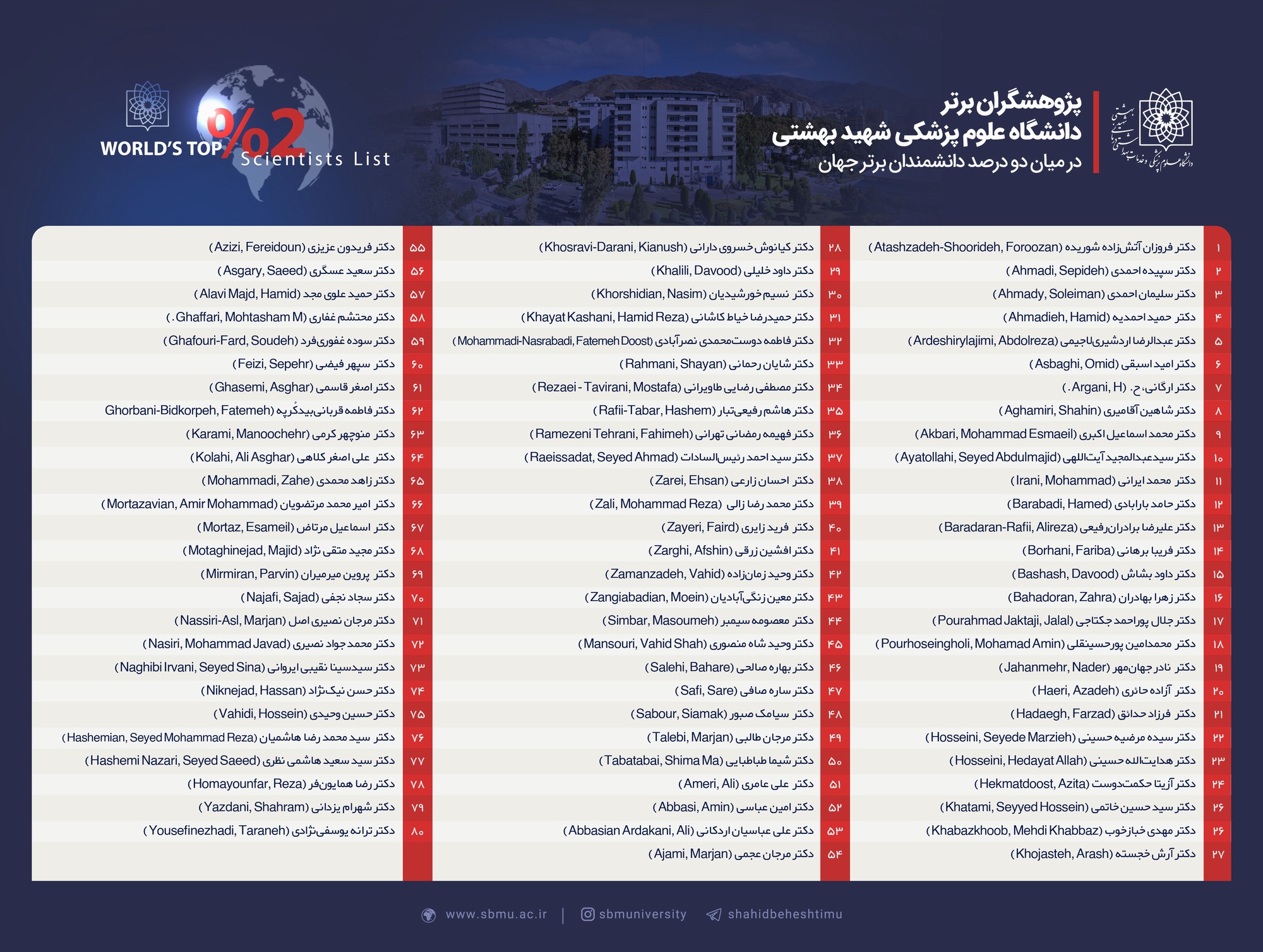 آمار پژوهشگران دانشگاه علوم پزشکی شهید بهشتی که موفق به حضور در فهرست معتبر ۲ درصد دانشمندان برتر جهان شدهاند، در طول سالهای اخیر روند رو به رشدی را تجربه کرده و به ترتیب از ۲۷ و ۵۸ نفر به ۸۰ نفر رسیده است. این افزایش، در کنار رشد سایر سنجههای علمی، نشاندهنده ارتقای موثر سطح تحقیقات و فناوری در دانشگاه است.